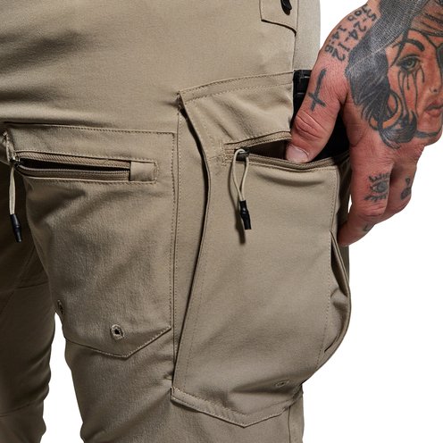 - Large Low-Profile, zippered cargo pockets featuring: - Bellowed Fabric to expand pockets -Drainage holes to dump water/debris - Inner elastic strap to secure large objects (Water bottle / magazines) - Small, zippered dip pockets at front legs