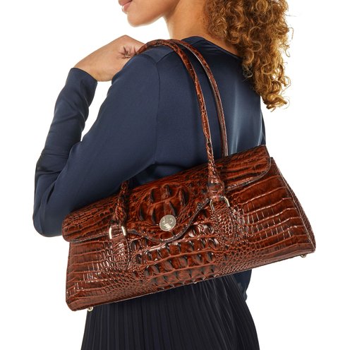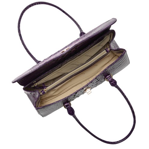 The Dayan is a satchel with turnlock closure, back slide in pocket, rolled handles, interior center zip pocket divider, double interior kangaroo pockets, interior zip pocket, bottom feet, and key clip