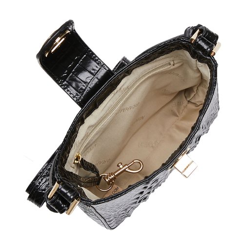 The Leia is a crossbody with a zip top closure, front pocket with tab turnlock closure, adjustable webbing crossbody strap, D-ring on strap for clip on accessories, interior zip pocket, single interior kangaroo pocket, pen pocket, and key clip