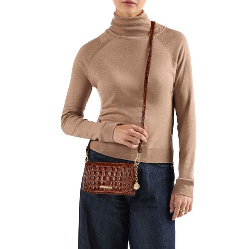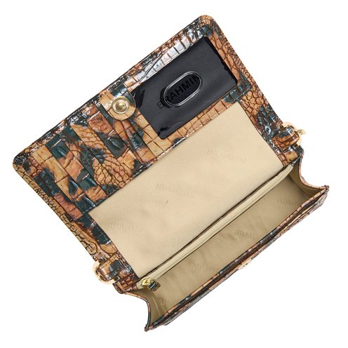A crossbody featuring a flap snap closure, adjustable crossbody strap, back slide in pocket, interior zip pocket, ID window, 11 credit card slots, and 2 slip pockets.
