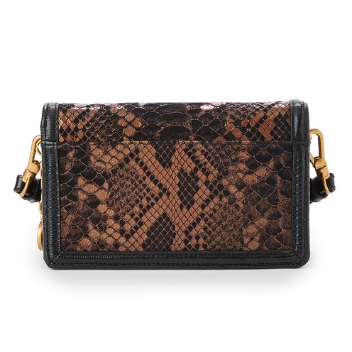 A crossbody featuring a flap snap closure, adjustable crossbody strap, back slide in pocket, interior zip pocket, ID window, 11 credit card slots, and 2 slip pockets.