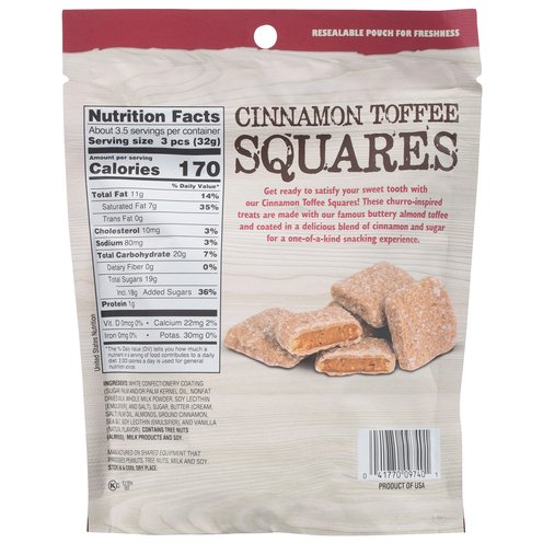 Churro inspired toffee squares with cinnamon & sugar. No preservatives or artificial flavors. Gluten free. Get ready to satisfy your sweet tooth with our Cinnamon Toffee Squares! These churro-inspired treats are made with our famous buttery almond toffee and coated in a delicious blend of cinnamon and sugar for a one-of-a-kind snacking experience. Resealable pouch for freshness. Product of USA.