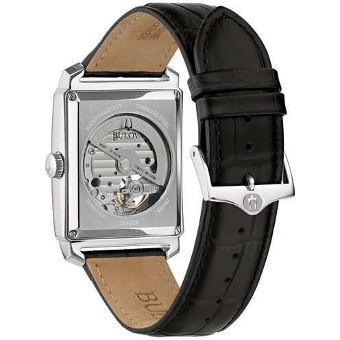 The new Sutton Automatic from Bulova introduces a fresh new shape to this classic watch. Inspired by the 1948 President style, the rectangular stainless steel case has a silver-white face with rose gold-tone accents, with a subtle texture and an open aperture to view the balance wheel of the movement. The case back features a mineral crystal exhibition window, to showcase the automatic movement powering this luxury watch. The case is paired with a rich brown alligator-grain leather strap for an elegant style. For anyone seeking a classic timepiece with a distinct personality, this is a piece that can�t be overlooked.