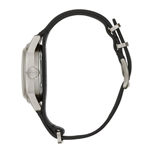 From the new CURV Collection. The worlds first curved chronograph movement features high-performance quartz technology with 262 kHz vibrational frequency for precise accuracy. Five-hand chronograph in titanium and stainless steel case, dark grey exhibition dial with rose gold-tone accents, exhibition screw-back case, curved sapphire glass with black metallization on the outer crystal, black rubber strap with 3-piece buckle closure