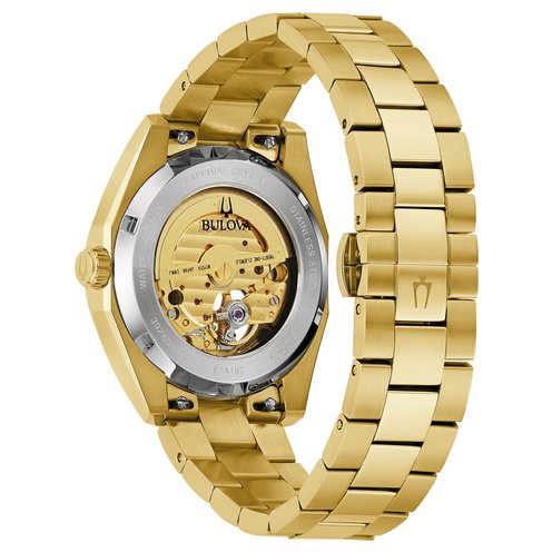 The Bulova men's Surveyor offers exceptional quality and sophisticated aesthetics at an accessible price. The gold-tone stainless steel case features sculpted edges and faceting which offer an effortless wear on the wrist, with polished and brushed finishing, a flat sapphire crystal, and a matching 3-link gold-tone stainless steel bracelet with quick-release tabs and a push-button deployant clasp. The radiant sunburst champagne dial exudes luxury and features gold-tone accents and hands with luminescent fill. A dial aperture provides a peek at the beating heart of the automatic 21-jewel movement that features a 42-hour power reserve and can be seen in full through a mineral crystal exhibition window in the caseback. For those with a discerning eye for refined luxury, this Bulova men's timepiece is the obvious choice.