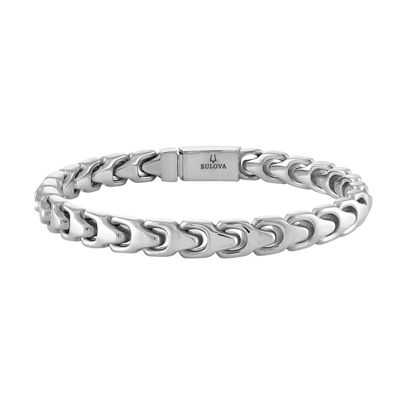 The fresh new Bulova Link™ Collection abounds in both personality and presence as our iconic tuning fork makes its debut as a signature design element. Features a box lock clasp etched with Bulova's iconic logo.