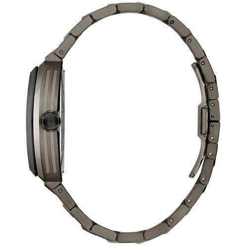 This Bulova men's watch from the Maquina collection offers daringly avant-garde design. The watch features a 40mm stainless steel case with a curved sapphire crystal and a stainless steel bracelet with a push-button deployant closure. The patterned dial with a toned dial ring and bridges has toned hands and markers with luminescent fill, with a central aperture revealing the inner workings of the 21-jewel automatic, also visible through a transparent case back, skeletonized movement which has a 42-hour power reserve. With its mechanical heart and unrivaled modern form, this Bulova men's timepiece offers a uniquely individual expression of style.