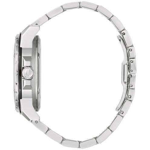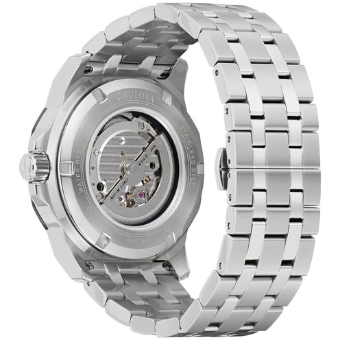 This new Bulova Marine Star men's watch combines classic nautical styling with a legacy that reaches back decades. The bold, angular silver-tone stainless steel case features brushed finishing with polished accents, a flat mineral crystal, and a screw-down crown. The striking dial combines sunray texture along the hour track and a central dial with a radiant sunburst finish, complete with hands with luminescent treatment, polished indices, and a running seconds sub-dial with orange accents. Visible through both the dial aperture and an exhibition case back, the open heartbeat automatic movement features 21 jewels and a 42-hour power reserve. The 45mm watch is complemented with a matching silver-tone stainless steel bracelet with a push-button deployant clasp. The watch is water resistant to 200 meters, living up to its name as a timepiece that can go wherever you do without missing a beat.