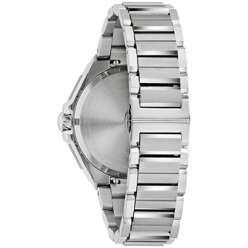 With its distinctive architectural design elements, this Bulova Series X men's watch makes a bold first impression.�The silver-tone stainless steel case and bracelet embody rugged, modern design while the matching bracelet features a secure push-button deployant clasp. The black 3-hand dial with date and exhibition window features Super-Luminova hands and markers, a contrasting blue second hand, and is protected by a curved sapphire crystal. This luxurious contemporary timepiece is water resistant up to 100 meters and is powered by Bulova's proprietary high-precision quartz Precisionist movement, a revolutionary 8-jewel quartz mechanism accurate to seconds per year and increased resistance to temperature changes, and with a smooth sweeping second hand. Take your precision to the next level with this innovative and stylish timepiece, fusing design and technology.