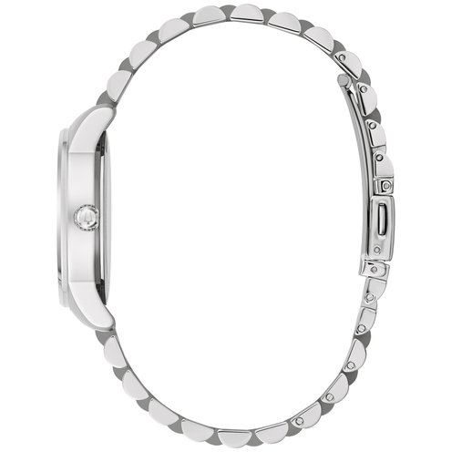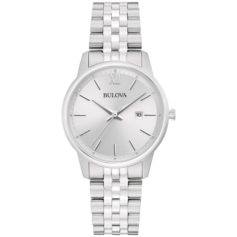 This Bulova watch features a silver-tone stainless steel case and bracelet with a clean silver-tone dial.