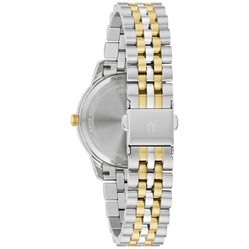 This Bulova watch features a two-tone stainless steel case and bracelet with a clean champagne-colored dial.