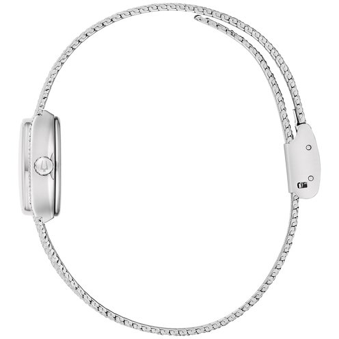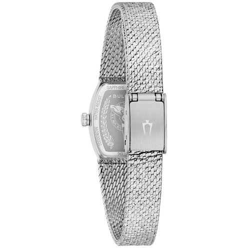 Step back in time to the glitz and glam of the 1970s with the Bulova women's Classic "Goddess of Time" watch. Borrowing the timeless design of vintage Bulova "Goddess of Time" watches, the silver-tone stainless steel tonneau case has a textured top and a brightly polished bezel, seamlessly transitioning to a textured mesh bracelet. Each variegated genuine blue sodalite stone dial is completely unique and is appointed with silver-tone applied markers and matching hands, while Bulova's Goddess of Time herself is etched onto the case back in intricate definition. Feel truly divine in this stunning Bulova ladies' timepiece.