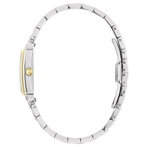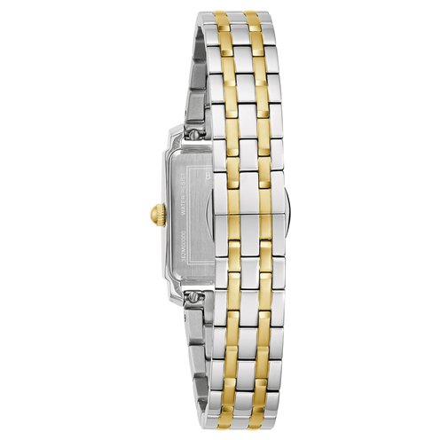 This all-new Bulova Ladies'' timepiece adds new style to the already impressive Sutton Collection. The elegant two-tone stainless rectangular steel case with a silver-tone body and a gold-tone frame around the mineral crystal. The opalescent mother-of-pearl dial is accented with gold-tone hour markers and matching hands for a look of true sophistication. A matching five-link bracelet features a deployant closure with pushers for a perfect fit. Water resistant to 30M. Case size 21x31.5mm
