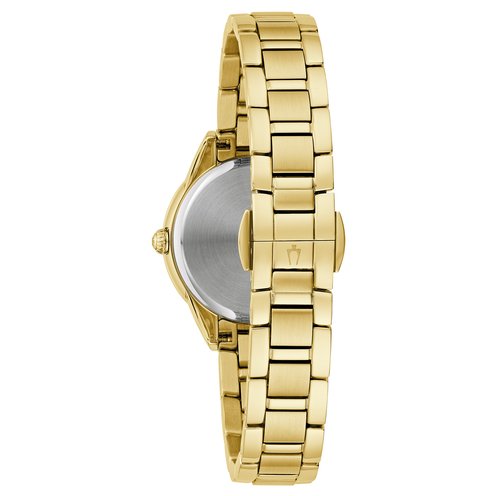 This elegant addition to the Bulova Ladies' Sutton collection offers a sophisticated timepiece for every occasion. The slender gold-tone stainless steel case is set with 16 dazzling diamonds and features a domed sapphire crystal for exceptional clarity. The lustrous genuine mother-of-pearl dial is accented with 3 diamonds and gold-tone hands and hour markers. Completing the timepiece is a matching gold-tone bracelet with a push-button deployant clasp. For the refined woman, the Bulova Ladies' Sutton provides a timepiece that doesn't compromise.