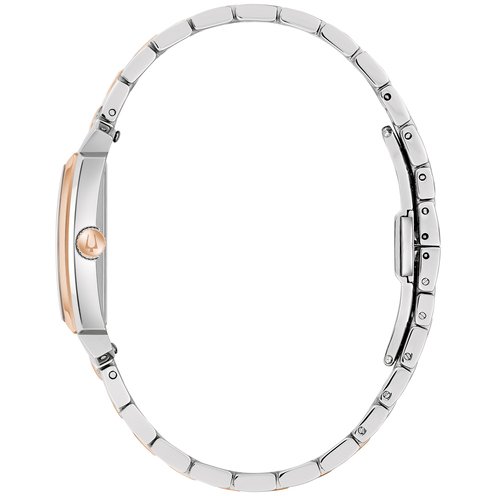 Embrace a refined elegance with this impressive Bulova women's timepiece from the Sutton collection. Distinguished by a rose gold- and silver-tone stainless steel rectangular case, the watch features a mineral crystal and a finishing that dazzles in the light. The brilliant white enamel dial is accented with applied rose gold-tone numerals and hands for a look of true sophistication. A matching five-link two-tone stainless steel bracelet features a deployant closure with pushers for a perfect fit and latched spring bars for easy release. Experience an elevated sense of luxury with this Bulova ladies' timepiece for the woman with an exceptional sense of style.
