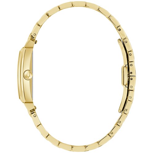 Embrace a refined elegance with this impressive Bulova women's timepiece from the Sutton collection. Distinguished by a gold-tone stainless steel rectangular case, the watch features a mineral crystal and a finishing that dazzles in the light. The brilliant white enamel dial is accented with applied gold-tone numerals and hands for a look of true sophistication. A matching five-link gold-tone stainless steel bracelet features a deployant closure with pushers for a perfect fit and latched spring bars for easy release. Experience an elevated sense of luxury with this Bulova ladies' timepiece for the woman with an exceptional sense of style.