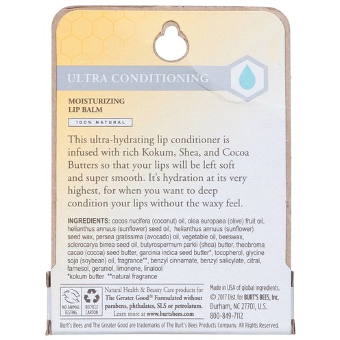 ULTRA CONDITIONING LIP BALM: One package contains one 0.15 oz. lip balm tube of Burt's Bees Ultra Conditioning Moisturizing Lip Balm to hydrate and condition dry lips