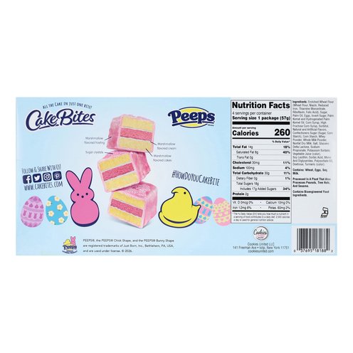 Hop into happiness with every bite! Peeps® Cakebites bring the iconic marshmallow sweetness you know and love into a soft, poppable snack cake. These fluffy marshmallow-flavored cakes are topped with a delicate sugar coating for just the right touch of sparkle and crunch. Made with no artificial colors, each bite delivers nostalgic Peeps® flavor in a fun, cake-forward twist. Perfect for spring celebrations, Easter baskets, or anytime you're craving a little sweetness, Peeps® Cakebites are a treat everyone will cheep about.