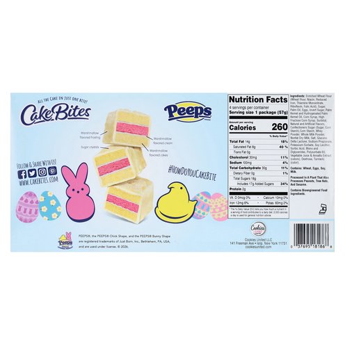 Hop into happiness with every bite! Peeps® Cakebites bring the iconic marshmallow sweetness you know and love into a soft, poppable snack cake. These fluffy marshmallow-flavored cakes are topped with a delicate sugar coating for just the right touch of sparkle and crunch. Made with no artificial colors, each bite delivers nostalgic Peeps® flavor in a fun, cake-forward twist. Perfect for spring celebrations, Easter baskets, or anytime you're craving a little sweetness, Peeps® Cakebites are a treat everyone will cheep about.