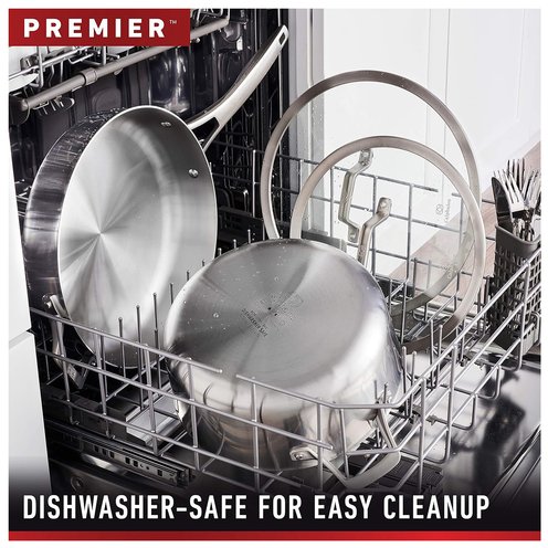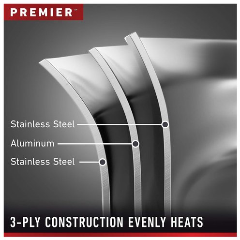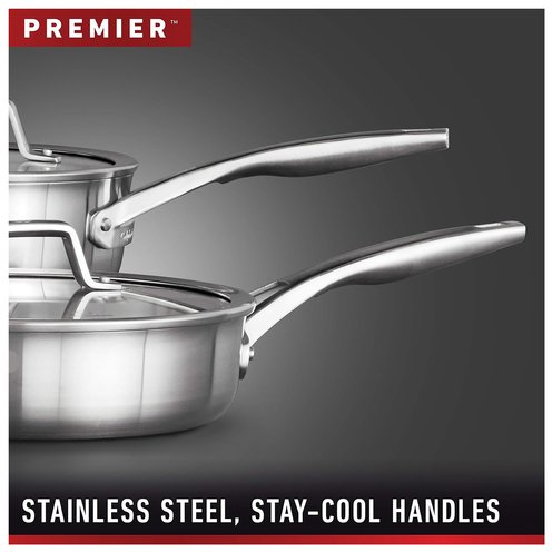 Calphalon Premier Stainless Steel Cookware delivers precision cooking performance, with an elegant, classic look that will inspire any chef. The 3-layer metal construction features a heavy-gauge aluminum core that distributes heat evenly and allows you to brown, sear, and saute with consistency and confidence. The elegant stainless steel finish is dishwasher-safe for easy cleanup. Calphalon Premier Stainless Steel Cookware is oven-safe up to 450 degrees F so it can go from the stovetop to the oven for heating and cooking versatility. Unlock your culinary genius with Calphalon Premier, and experience superior cookware that's built to last. Designated Chemical Disclosure: This product contains Aluminum, Stainless Steel (Iron, Chromium, Nickel, Manganese, Copper, Phosphorus).