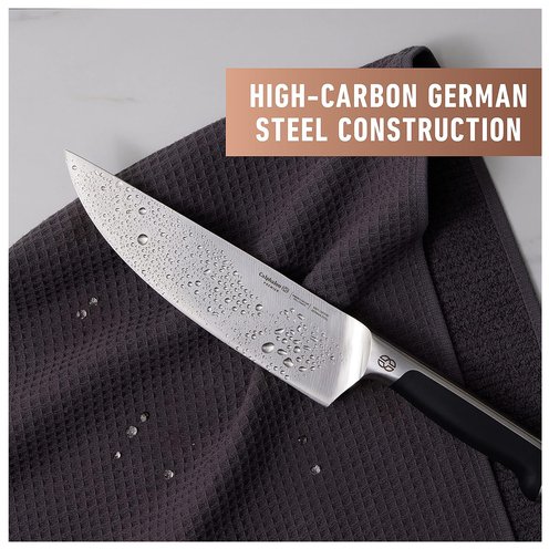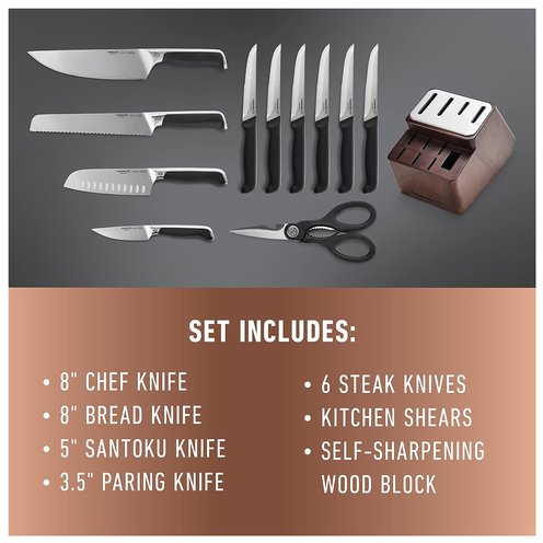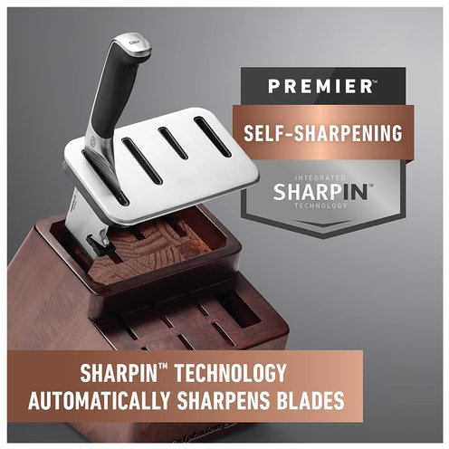 Calphalon® Premier™ SharpIN Knife Set with Sharpening Knife Block, 12 Piece, Carbon Steel. Calphalon Premier sharpening Knives stay sharp for a lifetime. The 12-piece cutlery set features a knife block integrated with built-in SharpIN ceramic technology that automatically sharpens straight-edge knives with every use. Specialty knives are fully forged from high-carbon, no-stain German steel and feature a blended bolster and full tang for better balance and strength; steak knives are made from stamped high-quality Asian steel. Improved ergonomically contoured handles allow specialty knives to fit firmly and securely in hand and are designed to reduce hand fatigue. Knife handles are also conveniently labeled for easy identification in the space-saving block with optimized knife placement that improves access to frequently used knives. This full knife set is built for taking on any cutting task with ease, from slicing to chopping to paring and more. Designed to last and complement modern cookware, this knife set with block is backed by a full lifetime warranty. Designated Chemical Disclosure: This product contains Stainless Steel (Iron, Chromium, Molybdenum, Manganese, Vanadium, Nickel, Phosphorus).