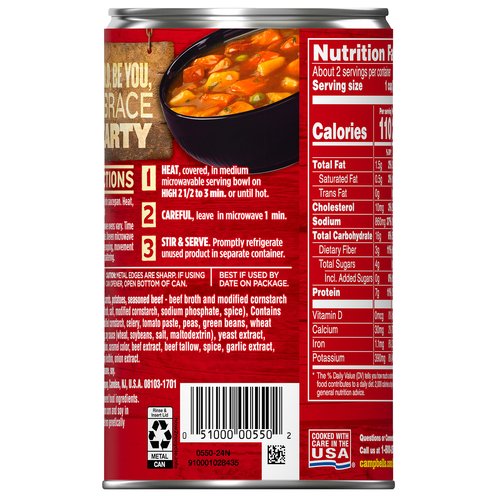 - 15g protein per can, 110 Calories per cup, 0.5g sat fat, 860gm sodium, 4g total sugars
