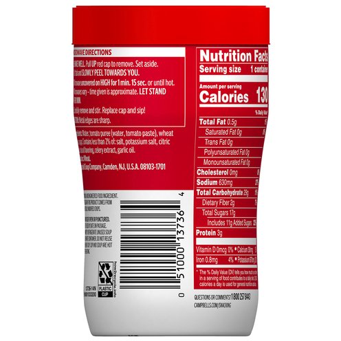 - Microwave Directions: 1. Shake well. Pull up red cap to remove. Set aside. Lift tab to slowly peel towards you. 2. Microwave uncovered on high for 1 min. 15 sec. or until hot. Microwaves vary - time given is approximate. Let stand for 1 min. 3. Carefully remove and stir. Replace cap and sip! Caution: Metal edges are sharp. Promptly refrigerate unused soup in separate container. Best if used by date on package.