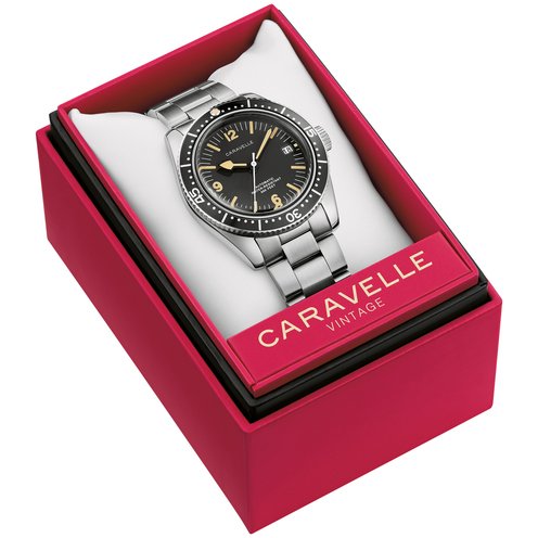 The return of an icon: The men's Caravelle Sea Hunter is reborn for the modern age. Inspired by one of Caravelle's most celebrated models, the new Caravelle Sea Hunter is sized for modern tastes at 39mm, with a case crafted from 316L stainless steel and echoing the sporting form of the original. Ensuring ideal legibility and functionality, a high-contrast black dial with a date display and luminescent hands and markers is complemented by a matching rotating 60-minute timing bezel. The Caravelle Sea Hunter is powered by a 21-jewel automatic movement with a power reserve of 42 hours. Paired with a 3-link stainless steel bracelet with a folding clasp and rated to 200m water resistance, this watch can go wherever you do so you can do whatever you want. Experience an icon remade with the men's Caravelle Sea Hunter.