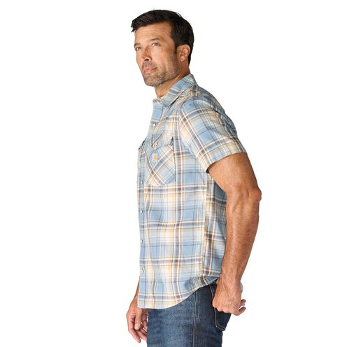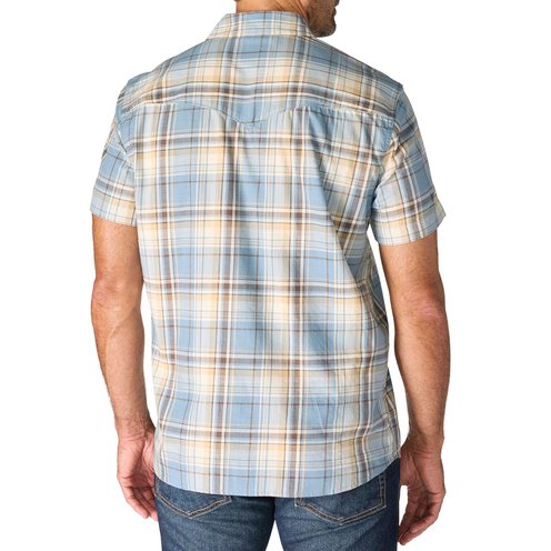 Built to move and flex, this men's short-sleeve western shirt feels comfortable whether you're on the job or out to dinner. Made from a lightweight cotton blend with shrink resistance and stretch recovery, it features brass-ring pearl snaps, a western yoke, and a relaxed fit.