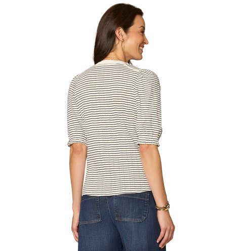 Cool, classic, and perfect for casual occasions, this striped knit top makes getting dressed a breeze. It has elbow length puff sleeves, a half placket, and intricate crochet detailing.