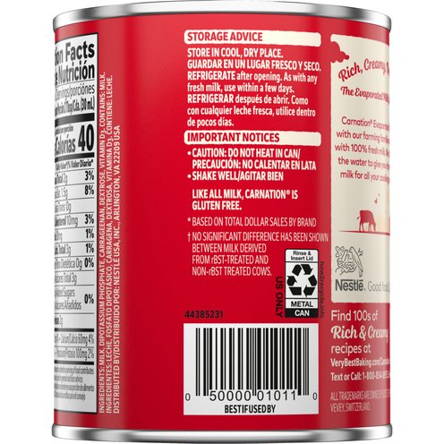 Per 2 Tbsps: 40 calories; 1.5 g sat fat (8% DV); 30 mg sodium (1% DV); 3 g total sugars. Like all milk, Carnation is gluten free. Vitamin D added. America's #1 evaporated milk. Estd 1899. Rich, Creamy, Delicious The Evaporated Milk Journey... Carnation Evaporated Milk starts with our farming families and is made with 100% fresh milk. We take out half the water to give you richer, creamier milk for all your cooking and baking. Nestle. Good food, Good life. No rBST(a). * Based on total dollar sales by brand (a) No significant difference has been shown between milk derived from rBST-treated and non-rBST-treated cows.