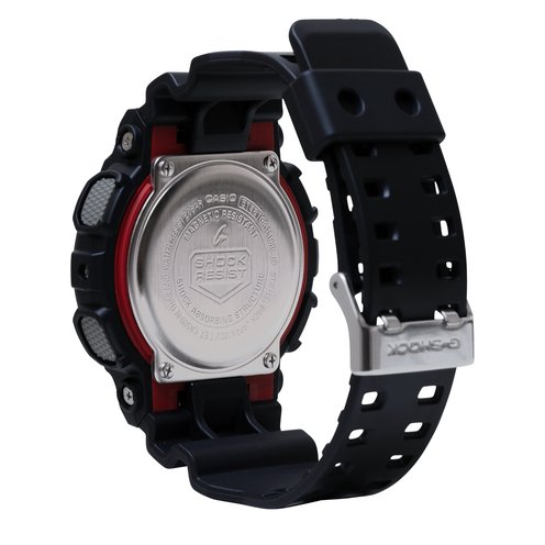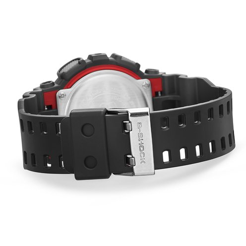 A stand-out with distinctive large case. The original color scheme is faithfully reproduced with touches of G-SHOCK red, representing the passion to take on challenges; blue, symbolizing excellent water resistance; and yellow, signifying outstanding shock resistance.