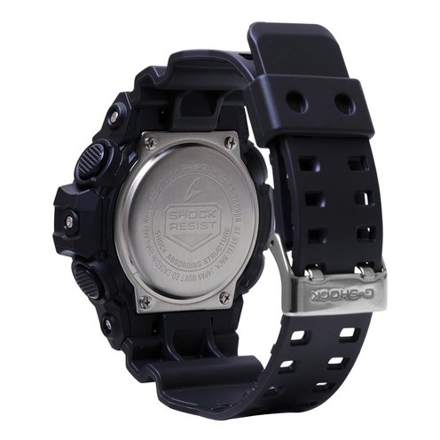 Go bold, tough, and intense, with the G-SHOCK black and red collection. The vibrant, high saturation red of the LCD really pops against the black bezel, band, and dial, not only enhancing visibility but also pushing the envelope of daring design. Activate the backlight to light up the digital display for even better visibility. Make a unique statement in all black, with a touch of bold red.