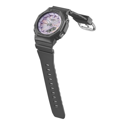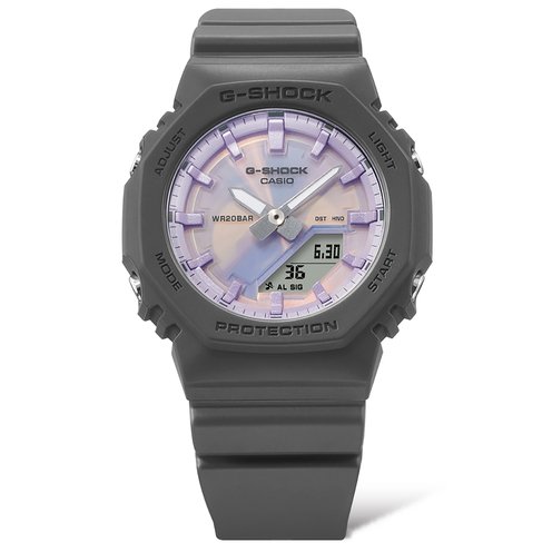 Lighten up your sunny style with a GMA-P2100 watch featuring a polarized color dial. This luxe-look compact timepiece gives off a colorful shine that changes from every angle, and the glossy indexes sparkle with even more impact. The matte-textured bezel and band project a striking, refined counterbalance that highlights the design's unique brilliance. Key resin components used in the bezel and band are made with bio-based resin, a material expected to help reduce environmental impact. Add a singular touch to your summer styling with this bold street fashion accent.