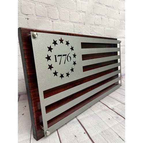 This piece is modern that meets rustic. Show your American Pride with the perfect wood and metal wall mountable flag. This item is Hand Crafted wood with a precise plasma cut piece of metal.