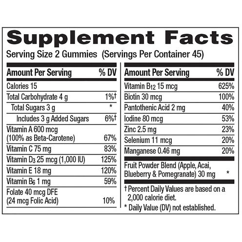 Active Ingredients: Glucose Syrup, Sugar, Gelatin, Water, Ascorbic Acid (Vit. C). Contains <2% of: Beta-Carotene, Biotin, Calcium Pantothenate, Carnauba Wax, Cholecalciferol (Vit. D3), Citric Acid, Cyanocobalamin (Vit. B12), DL-Alpha Tocopheryl Acetate (Vit. E), Folic Acid, Fruit and Vegetable Juice Concentrates (Purple Carrot, Cranberry, Black Raspberry) (color and/or flavor), Fruit Powder Blend (Apple, Acai, Blueberry & Pomegranate), Invert Sugar, Lactic Acid, Malic Acid, Manganese Sulfate, Mannitol, Medium-Chain Triglycerides, Natural Flavors, Potassium Iodide, Pyridoxine Hydrochloride (Vit. B6), Sodium Lactate, Sodium Selenate, Zinc Sulfate.