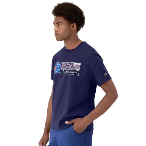 Inspired by nostalgic graphics and collegiate iconography, this men's T-shirt is rooted in our Champion® heritage. With unmatched comfort and softness, our graphic T-shirt for men is your best companion, from sport to street. Crafted with attention to detail and built to be a longtime favorite, it has a ribbed collar and sturdy stitch work. Iconic C logo hits at the sleeve, showing everyone what you’re all about. Pair this men’s T-shirt with your favorite Champion joggers and shorts for a rounded out, always-in look.