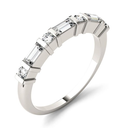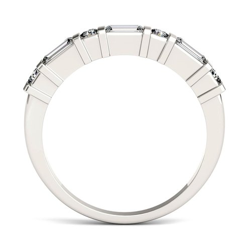 A sleek, beautiful band with a alternating baguette and round cut gemstones in a bar setting. Pair with other rings to create a whole look or wear alone for a bit of added shine.