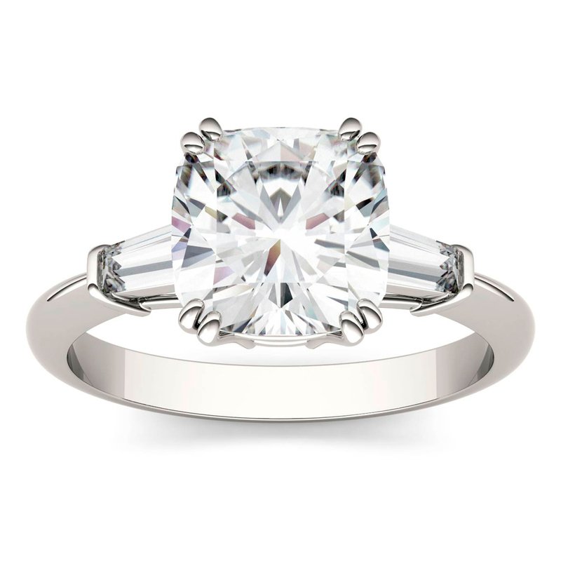 Stunningly crafted in 14k white gold, this engagement rings offers modern style with vintage appeal. Featuring a brilliant cushion cut moissanite, in a double four prong setting, bound by exquisite step baguettes on each side. Showcasing a 2.77ct total diamond equivalent weight, this heirloom-quality gem is for the confident woman.