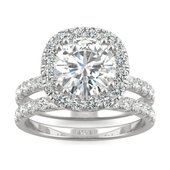 Behold the splendor of this Forever Bright moissanite halo bridal set. The center stone is an 8mm round moissanite surrounded by a halo of moissanite gemstones which also accent the shoulders.