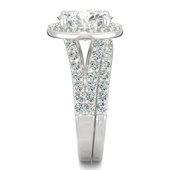 Stately glamour abounds with this stunning bridal set. A gorgeous round moissanite is brilliantly surrounded by a halo of glistening accent gems resting atop a split shank gem lined ring. The perfectly contoured moissanite accented wedding band completes this bridal set for an eternal, 'I do.'