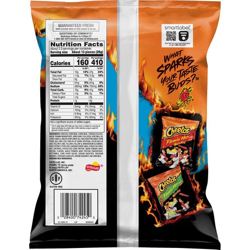 Cheese flavored snacks. Flamin hot flavored puffs. Gluten free. New look, same taste! What sparks your taste buds? Flamin hot crunchy. Flamin hot lemon crunchy.