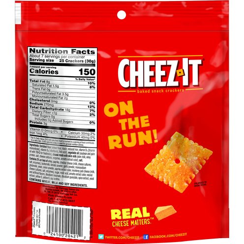 Made with 100% real cheese. Per 25 Crackers: 150 calories; 1.5g sat fat (8% DV); 270mg sodium (12% DV); 0g total sugars. On the run. Real cheese matters.