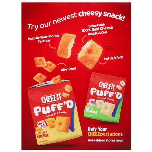 Contains a bioengineered food ingredient. Try our newest cheesy snack! Melt-in-your-mouth texture. Baked with 100% real cheese inside & out. Bite sized. Puffy & airy. Cheez-It Puff'D Double Cheese. Cheez-It Puff'D White Cheddar. Defy your cheezpectations.