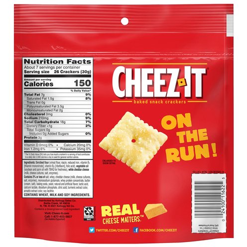 - Enriched Flour (Wheat Flour, Niacin, Reduced Iron, Vitamin B1 [Thiamin Mononitrate], Vitamin B2 [Riboflavin], Folic Acid), Vegetable Oil (Soybean and Palm Oil with TBHQ for Freshness), White Cheddar Cheese (Milk, Cheese Cultures, Salt, Enzymes). Contains 2% or Less of Salt, Whey, Cheddar Cheese (Milk, Cheese Cultures, Salt, Enzymes), Monosodium Glutamate, Whey Protein Concentrate, Butter (Cream, Salt), Baking Soda, Yeast, Natural and Artificial Flavor, Lactic Acid, Calcium Lactate, Disodium Phosphate, Citric Acid, Turmeric Extract Color, Annatto Extract Color, Soy Lecithin.