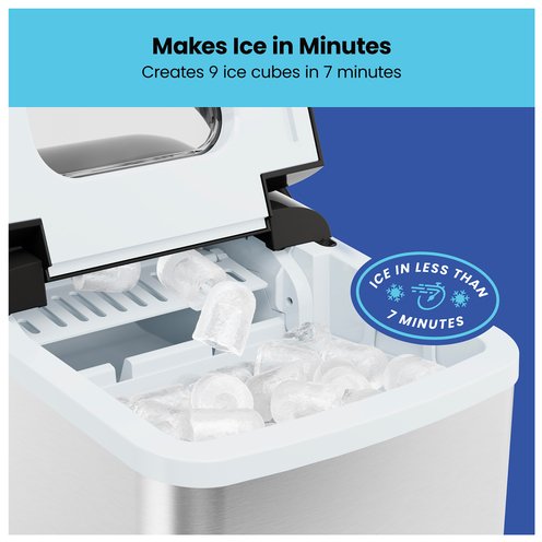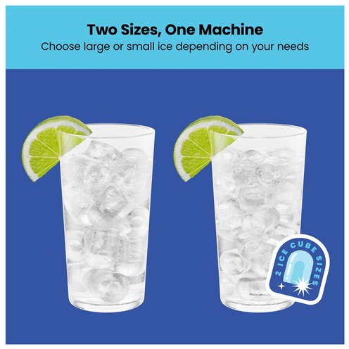 The Chefman Dual-Size Ice Machine is your ice making countertop companion. With two ice sizes to choose from, you can have ice when and where you want. Display lights indicate when ice-making is complete, when the water to make ice is low, or when the cleaning cycle has been completed. The included ice basket holds 1.3 lb. of ice, and the top viewing window helps you see how much ice is left. The 5 ft. power cord and cooler-style drain plug simplify setup and take down. Plastic serving scoop and removable ice basket included. Purchase includes a 1-year assurance from Chefman.