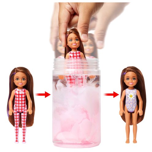 Barbie® Color Reveal™ dolls deliver an unboxing experience with six surprises, including a Chelsea™ doll whose look is revealed with water! A small doll with a sweet picnic outfit and colorful hairstyle is guaranteed, but each doll's look remains a mystery until revealed. With the Picnic Series, kids will find one of three possible dolls, each with clothes and accessories hidden in the three mystery bags. Color-change effects on Chelsea™ doll's bodice add more wow. Kids can use the packaging tube to store the accessories and other favorites when play is over. Which doll will you reveal? Each sold separately, subject to availability. Dolls cannot stand alone. Colors and decorations may vary.