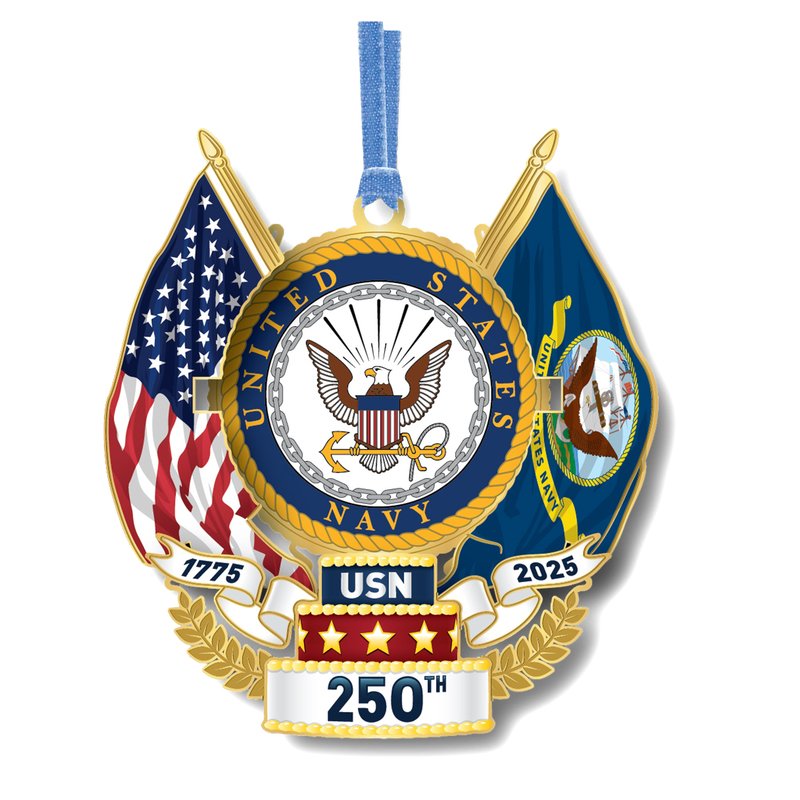 Honor America's naval legacy with this exquisite commemorative ornament celebrating the U.S. Navy's 250th Anniversary. Meticulously etched in brass and finished in lustrous 24k gold, this keepsake features the official U.S. Navy emblem alongside both the Navy and American flags. A special 250th anniversary cake design adds a festive touch to this historic celebration.