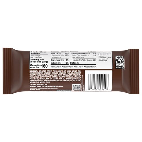 - Unbleached Enriched Flour (Wheat Flour, Niacin, Reduced Iron, Thiamine Mononitrate (Vitamin B1), Riboflavin (Vitamin B2), Folic Acid), Semisweet Chocolate Chunks (Sugar, Chocolate, Cocoa Butter, Dextrose, Milk, Soy Lecithin), Sugar, Soybean and/or Canola Oil, Semisweet Chocolate Chips (Sugar, Chocolate, Cocoa Butter, Dextrose, Milk, Soy Lecithin), Palm Oil, Leavening (Baking Soda, Ammonium Phosphate), Molasses, High Fructose Corn Syrup, Whey, Salt, Soy Lecithin, Caramel Color, Artificial Flavor.