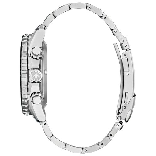 Citizen's Promaster Diver is water resistant up to 200 meters, making it the perfect companion for your next underwater adventure. The stainless steel band and case are offset with a blue dial and luminous hand markers, so you can read it no matter where - or how deep - you are. Additional features include a chronograph, 12/24 hour time, the date, and a rotating blue bezel. It is also anti-magnetic and anti-shock, and is powered by light with Eco-Drive technology.
